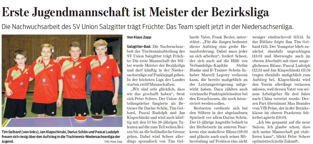 Ein Blick zurück Jugendarbeit zahlt sich bekanntlich aus. Das gilt sicher nur bedingt, wenn man in hohen Ligen spielt, weil der Sprung aus der Jugend in höhere Klassen nur wenigen gelingt. Immerhin spielen bei Union einige ehemalige Talente in der 1. und 2. Herrenmannschaft, die mit 3. Bundesliga und Landesliga doch hoch angesiedelt sind. Neben Felix Wilke in der I. sind es Pascal Ludolph und Darius Schön in der II, hier abgebildet bei ihrem größten Erfolg im Jugendbereich.